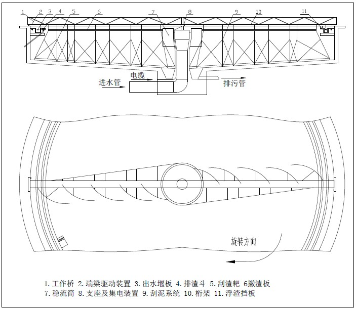 中心支座由固定支撑座、回转轴承和桥架组成,可同时承受轴向力、径向力和倾覆力矩。集电装置采用滑环式集电装置,由集电环和电刷架组成。浮渣刮板、浮渣耙板、浮渣漏斗组成排渣机构,能有效地清除水面浮渣。工作桥是连接中心支座和行走端梁的大型部件,其上有走道板和栏杆,钢梁的下面连接刮泥结构、排渣机构等,在行走装置的带动下来完成刮泥、排渣工作。