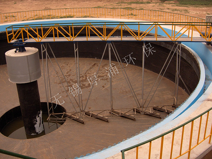 原水从池底经中心支墩上不流出,并经稳流筒配水后,呈辐射状流向池子周边集水槽出水,随着辐向流速的降低,原水中的悬浮物被分离而沉降于池底。工作桥以中心支座为圆心,带动刮泥、排渣机构,在驱动装置驱动下将污泥刮集至沉淀池中心集泥槽,依靠水压或泵排出池外,上部浮渣由刮渣板同步刮至排渣斗排出。